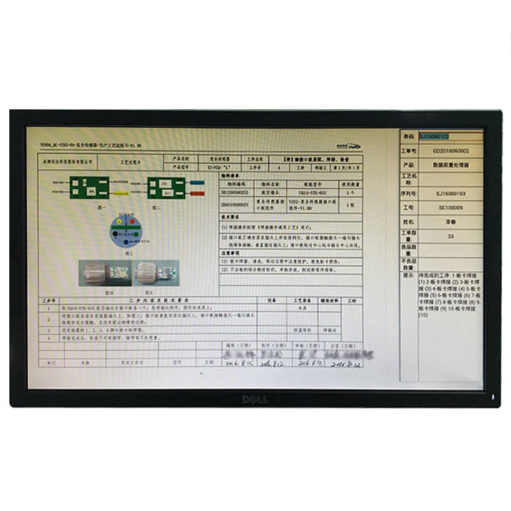液晶电子看板,采用高分辨率,显示内容丰富,色彩和布局可根据客户喜好进行设计,同时可通过以太网/无线网络将工厂内的所有电子看板进行集中管理,并且将实时的生产数据上传到服务器,管理人员在办公室就可以实时查看生产进度,返修率等数据。