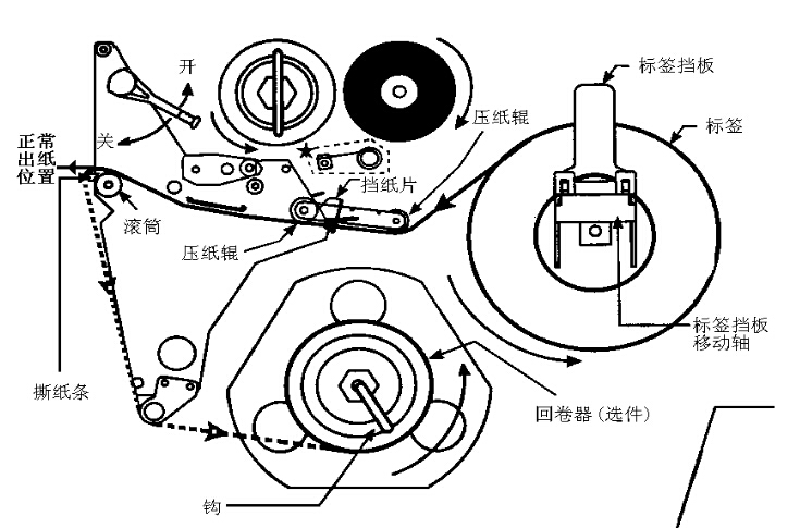 3.当条码纸被卷入打印头下面的滚筒中时,千万不能用刀片来划开条码纸,以免损伤滚筒。只可以用手慢慢反向转动滚筒将条码纸撤出。