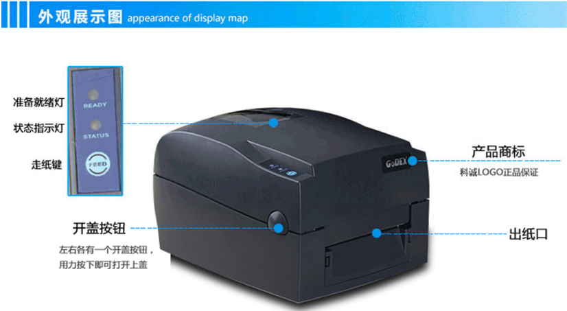 科诚(GODEX)G500U条码打印机操作简单,价格经济实惠,机器美观便捷精巧-外观颜色时尚典雅,拆装简易,全能-适用于水洗唛,热敏纸,哑银纸,铜版纸等.28多多条码为您介绍物流行业最爱的打印机.